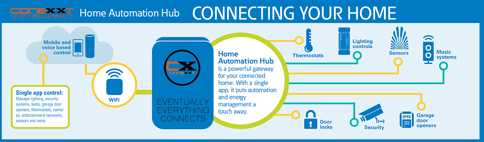 A smart home hub is is Hardware Unit installed in your home or business that connects devices on a home automation network and controls communications among them. Sometimes referred to as a smart home bridge, a smart home hub collects and translates various protocol communications from smart home devices.